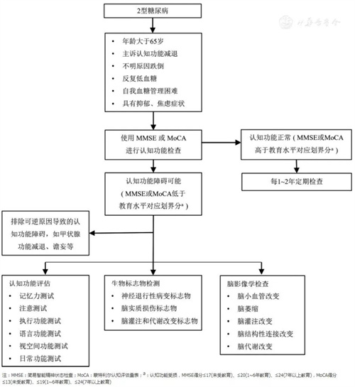 2型糖尿病患者具有多个认知域的功能障碍,对2型糖尿病患者认知功能减退的早期筛查十分重要。常用的筛查与诊断工具包括神经心理评估量表、生物学标志物和脑影像学检查。评估结果如为认知障碍低风险,则应每1-2年持续监测;如为高风险,则需再进行详细的神经心理学测试。在评估过程中,排除并治疗常见的可逆性认知功能障碍也很重要,包括谵妄、药物不良反应、代谢或内分泌异常、睡眠障碍和抑郁症等。