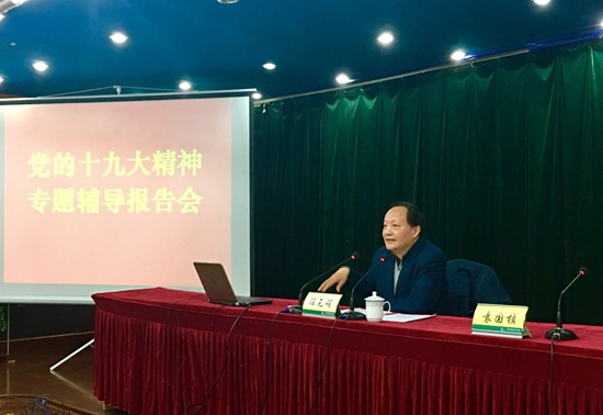 1月10日下午,我院举办党的十九大精神第二场专题辅导报告会,邀请前无锡市委宣传部副部长陈尧明同志作《新时代党的政治宣言和行动纲领》辅导报告,对党的十九大精神作进一步全面深入的解读。会议由院党委书记袁国桢主持,全体150余名党员代表参加。