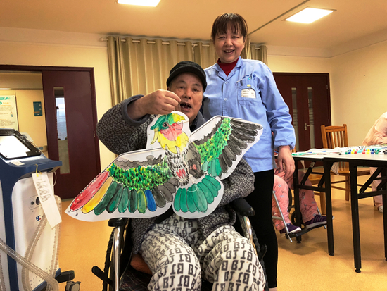 风筝绘制看似简单,但对于这些患者而言却并非易事。一些患者或有肢体功能障碍,或存在偏视、偏盲问题,甚至有些患者还存在些许认知问题。但再大的困难也阻挡不了大家与春天约会的热情,很多患者都积极参与到活动中来。从设计、调色、配色、涂色……一步一步,在家人、陪护工和病区医务人员的指导帮助下,最后一个个原本没有任何色彩的风筝就在大家手下“活”了起来,每一个风筝都替他的主人诉说着内心的“愿望”。