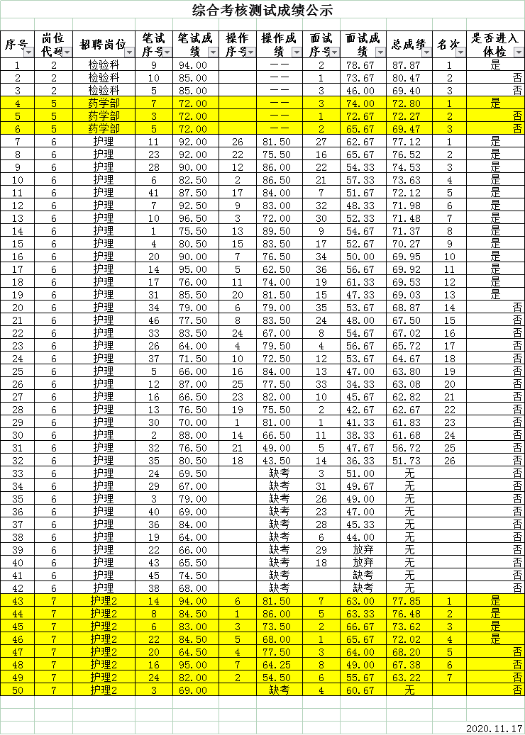 2020年第三批编外人才公开招聘综合考核测试成绩公示